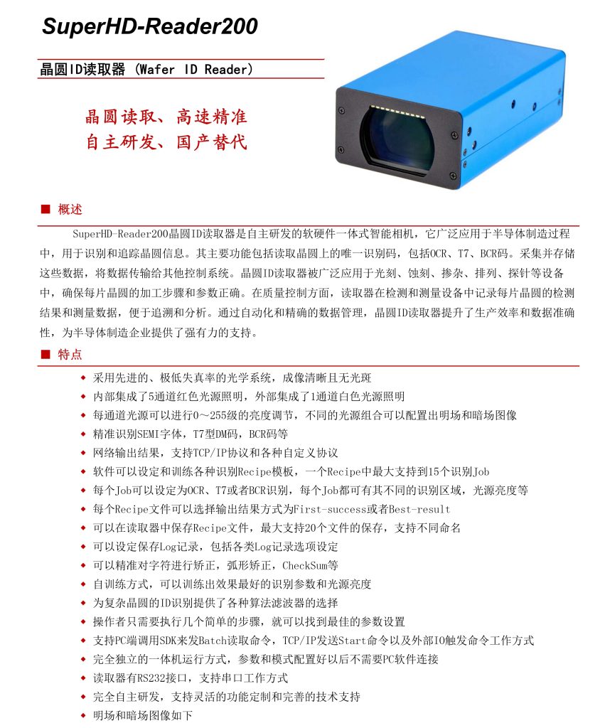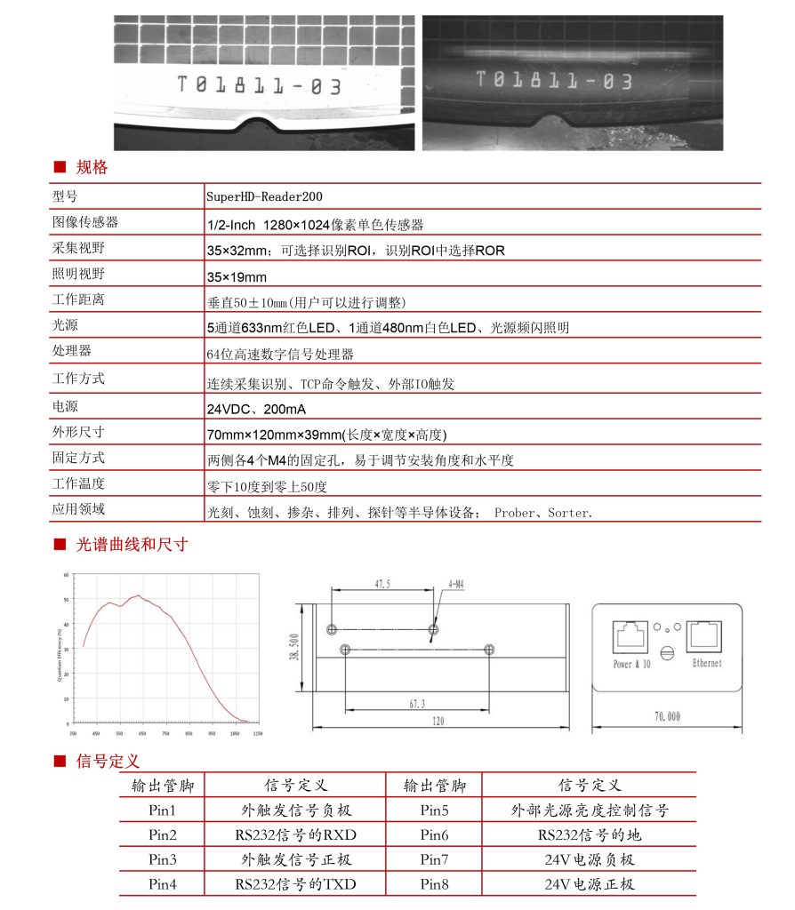 6.?????可以配備不同的鏡頭,從而進(jìn)行大字體和很小字體的的OCR字符拍攝識別,可以突出反光材料表面例如晶圓上的OCR字符。